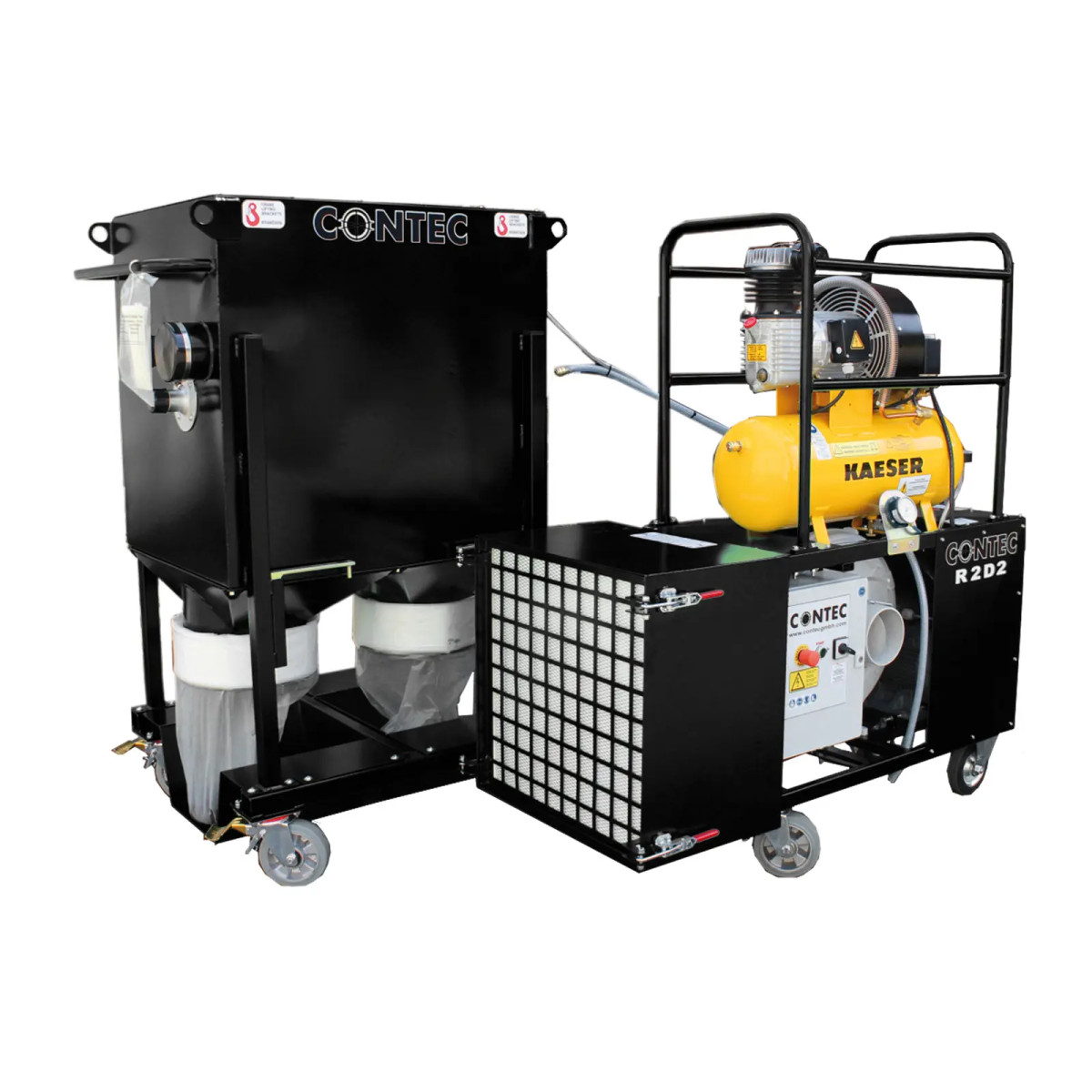 Die saugstärkste Absauganlage der Produktgruppe. Die Abreinigung der Filterpatronen erfolgt automatisch durch Druckluftstöße. Für den einfacheren Transport ist R2D2 teilbar. Die Kraftstation enthält alle Steuereinheiten und Aggregate wie Ventilator, Elektromotor und Kompressor. Die Filtereinheit enthält die Patronenfilter und den/die Auffangbehälter. Auf der Baustelle lassen sich dann beide Teile miteinander koppeln und als eine Einheit verschieben. Die Filterstation wird in zwei Versionen geliefert. Die erste Version sammelt den anfallenden Staub in einer Art Schubkarre. Die zweite Version sammelt den Staub in Endlossäcken (Longopacks). Unsere Absauganlage R2D2 ist auch leistungsgesteigert (höhere Saugleistung + größere Filterfläche) als R2D2-7 erhältlich.