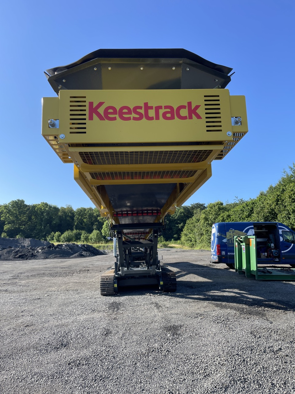 Das raupenmobile KEESTRACK Haldenband S5 mit 23 m Länge und 9,5 m Abwurfhöhe, mit einer Gurtbreite von 1.000 mm und einem Gewicht von 12,5 t kann bis zu 2.500 t Material aufgehalden, selbstverständlich mit „load-sensing“-Hydrauliksystem.